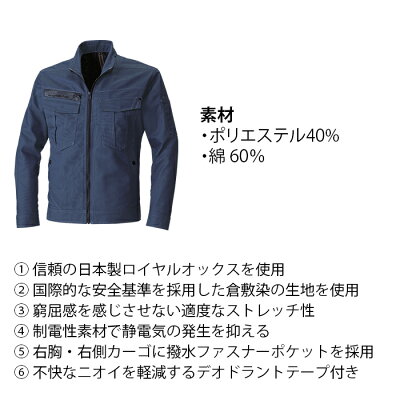 商品説明1022-00 長袖ブルゾン●オールシーズン用●素材:綿60% ポリエステル40%フロント:金属ファスナー、胸:樹脂ファスナー、金属ボタン、金属ボタン(隠しドットボタン)●静電性素材、ストレッチ、消臭、野帳ポケット、胸止水ファスナー、撥水袋布(野帳が入る)、脇ポケットドットボタン、反射ステッチ、胸ペン差し、袖ペン差し、デオドラントテープ、ひじダーツ、袖口アジャストボタン、シリコンネーム●サイズ:S(胸囲/104、肩巾/44、着丈/61、袖丈/56)、M(胸囲/110、肩巾/46、着丈/62、袖丈/58)、L(胸囲/114、肩巾/48、着丈/63、袖丈/60)、LL(胸囲/118、肩巾/50、着丈/65、袖丈/62)、3L(胸囲/124、肩巾/52、着丈/67、袖丈/63)、4L(胸囲/132、肩巾/54、着丈/69、袖丈/63)●カラー:ネイビー、ブラック、シルバーグレー1022-08 カーゴパンツ●オールシーズン用●素材:綿60% ポリエステル40%金属ファスナー、金属ボタン●静電性素材、ストレッチ、消臭、野帳ポケット、タックボタン、デオドラントテープ、カーゴ止水ファスナー、撥水袋布(野帳が入る)、ひざダーツ、裾紐通しホール(紐は付いていません)、カーゴペン差し、反射ステッチ、カラビナループ、シリコンネーム●サイズ:S(ウエスト/73、股下/82、わたり巾/31.5)、M(ウエスト/79、股下/82、わたり巾/33)、L(ウエスト/85、股下/82、わたり巾/34.5)、LL(ウエスト/91、股下/82、わたり巾/36)、3L(ウエスト/100、股下/82、わたり巾/38)、4L(ウエスト/110、股下/82、わたり巾/40)●カラー:ネイビー、ブラック、シルバーグレー商品仕様1022-00 長袖ブルゾンワーキング業界初、「倉敷染」。