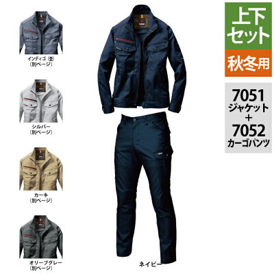 商品説明7051 ジャケット●秋冬用●素材:T/Cストレッチツイル(伸長率15%)、制電ケア設定●混率:ポリエステル80%・綿20%●ネームホルダーループ●レベルブック収納ポケット(右・深さ21cm)●Phone収納ループ(右)●内ポケット(左)●胸ペンさし(左)●袖ペンポケット(左)●ウエストドットアジャスター(脇ゴムなし)●袖アームタック●背アームノーフォーク●サイズ:SS(バスト/100、肩幅/40、袖丈/55、着丈/58)、S(バスト/106、肩幅/42、袖丈/57、着丈/60)、M(バスト/110、肩幅/45、袖丈/59、着丈/63)、L(バスト/114、肩幅/47、袖丈/60、着丈/65)、LL(バスト/118、肩幅/49、袖丈/61、着丈/67)、3L(バスト/122、肩幅/51、袖丈/62、着丈/69)、4L(バスト/128、肩幅/53、袖丈/62、着丈/71)、5L(バスト/134、肩幅/55、袖丈/62、着丈/71)●カラー:ネイビー、シルバー、カーキ、オリーブグレー、インディゴ7052 カーゴパンツ●秋冬用●素材:T/Cストレッチツイル(伸長率15%)、制電ケア設定●混率:ポリエステル80%・綿20%●サイズチップ(左)●ピスフラップ(左・ドットボタン止め)●コインポケット(右)●長財布・レベルブック収納ポケット(右・深さ23cm)●両脇ツインループ●ペンさし(左)●Phone収納ポケット(左)●サイズ:S(ウエスト/74、股下/80)、M(ウエスト/78、股下/80)、L(ウエスト/82、股下/80)、LL(ウエスト/86、股下/80)、3L(ウエスト/90、股下/80)、4L(ウエスト/96、股下/80)、5L(ウエスト/102、股下/78)、6L(ウエスト/110、股下/78)、7L(ウエスト/118、股下/78)、8L(ウエスト/126、股下/78)●カラー:ネイビー、シルバー、カーキ、オリーブグレー、インディゴ商品仕様7051 ジャケットハードな動きに対応する快適ストレッチ素材シリーズ。
