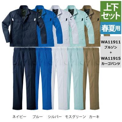 商品説明WA11911 長袖ブルゾン●春夏用●素材:ストレッチサマーツイル ポリエステル65%・綿35%、ボタン/プラスチック●帯電防止素材、ストレッチ、反射パイピング、実用新案登録済 懐ポケット(静電テープ引手付き)、カラー配色、カラーカン止め、背裏メッシュ、肩ダーツ、脇消臭テープ(デオグラフト)、袖口調節釦、裾調調節釦、左袖二重ペン差し、左胸二重ペン差し、左胸ポケットネームループ●サイズ:S(着丈/61、肩巾/44、袖丈/54、胸囲/108)、M(着丈/63、肩巾/46、袖丈/56、胸囲/112)、L(着丈/65、肩巾/48、袖丈/58、胸囲/116)、LL(着丈/67、肩巾/50、袖丈/60、胸囲/120)、XL(着丈/69、肩巾/52、袖丈/60、胸囲/124)、4L(着丈/71、肩巾/54、袖丈/60、胸囲/130)、5L(着丈/71、肩巾/56、袖丈/60、胸囲/136)●カラー:ネイビー、ブルー、シルバー、モスグリーン、キャメルWA11915 ワンタックカーゴパンツ●春夏用●素材:ストレッチサマーツイル ポリエステル65%・綿35%、ファスナー/[フロント]金属、ボタン/プラスチック●帯電防止素材、ストレッチ、反射パイピング、スルーポケットカーゴ(フラップなし、ファスナーなしだから、出し入れが容易)、後ろ中心太ベルト、カラー配色、カラーカン止め、右脇カラビナループ、裾調整用穴かがり、股消臭テープ(デオグラフト)●サイズ:70(ウエスト/70、股下/80)、73(ウエスト/73、股下/80)、76(ウエスト/76、股下/80)、79(ウエスト/79、股下/80)、82(ウエスト/82、股下/80)、85(ウエスト/85、股下/80)、91(ウエスト/91、股下/80)、95(ウエスト/95、股下/80)、100(ウエスト/100、股下/78)、105(ウエスト/105、股下/78)、110(ウエスト/110、股下/78)、115(ウエスト/115、股下/78)、120(ウエスト/120、股下/78)●カラー:ネイビー、ブルー、シルバー、モスグリーン、キャメル商品仕様WA11911 長袖ブルゾンマルチファンクション。