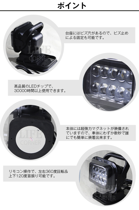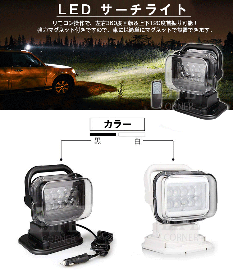 今、大注目!!イチ押し商品!! アイテム情報 商品仕様 LEDパワー: CREE LED 10pcs * 5W = 50W 商 品 名: CREE LED サーチライト 50W 本 体 色: 黒色 又は 白色 照 射 角: 左右回転 360度 ・ 首振り回転 120度 明 る さ: (約) 3200LM 発 光 色: 昼光色(6000K-6500K) LED 寿命: (約) 50000時間 配線長さ: (約) 2.8m 照射距離: (約) 450m 動作電圧: DC12-24V 防水仕様: IP65 (生活防水) 角度調整: 上下左右調節可能 重 さ: (約) 3.5KG 本体素材: プラスチック、レンズ材料PC 商品ポイント ☞ リモコン操作で、左右360度回転&上下120度首振り可能! ☞ 強力マグネット付きので、車には簡単にマグネットで設置できます。